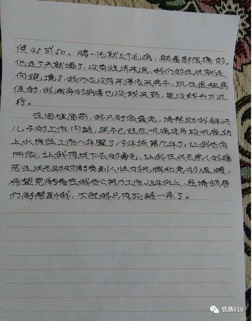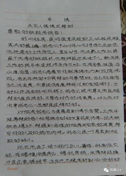 希望铁路领导能确保国家赋予我的权益,能积极主动的为你们所犯的错误承担责任,解决孩子转正式工的问题(劳务工已经在车务段上水岗位工作八年了),请求段领导给我们一条活路,给我们一个公道!