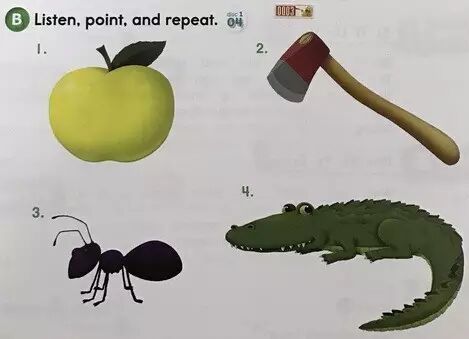 第二个练习☞ Listen, point and repeat听音辩音。认图并跟读,同时通过对应的图画,了解常见词的含义。