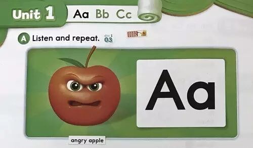 第一个练习☞ Listen and repeat识读练习学习A字母本身的发音和在单词中的发音,同时列举两个含有A的单词进行练习,点读的时候,会有女声领读,童声跟读,娃一下子就被带动起来,张口就会模仿。通过图画和下方标注的对应单词,孩子可以看图理解词义。