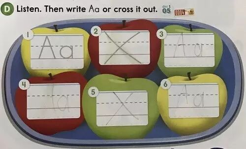 第四个练习☞ Listen. Then write Aaor cross it out. 相当于一个小测试进一步强化读音和书写,女声匀速读六个单词,娃听单词完成测试,在含有A字母发音的地方书写Aa;没有A音,就划个叉叉。现学现练,趁热打铁。