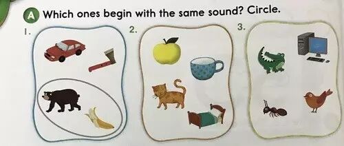 第一项是看图选物,孩子不需要掌握所有单词的发音和意思,只需将图中首字母发音相同的图片圈出即可。这项内容旨在巩固本单元学过的音素,内容相对较为简单。