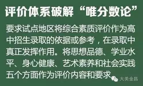 进一步扩大综合改革试点,各省(区、市)要选择有条件的地市学习借鉴一些地区改革的成功经验,结合本地实际,积极探索基于初中学业水平考试成绩、结合综合素质评价的招生录取模式。重在改变目前高中招生将部分学科成绩简单相加作为录取唯一依据的做法,克服唯分数论。