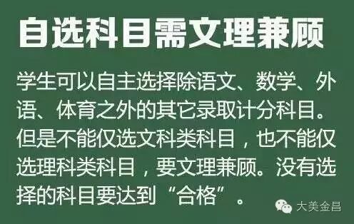 学生的学业水平考试,将可以选择除语文、数学、外语、体育之外的其它“录取计分科目”。为了防止出现偏科,学生在选择录取计分科目时,要做到文理兼顾,不能只选文科类科目,也不能只选理科类科目。没有选择的科目,不仅“要学”、“要考”,还要达到“合格”。