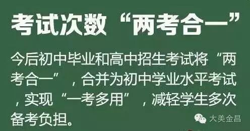 已经实行初中毕业、高中招生“两考合一”的地区要统一规范为初中学业水平考试。个别没有实行“两考合一”的地区要积极创造条件逐步过渡到初中学业水平考试,实现一考多用,避免多次考试,加重学生备考负担。