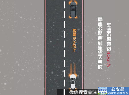 根据相关法律规定,机动车在高速公路上行驶,遇有雾、雨、雪、沙尘、冰雹等能见度小于100米的天气时应开启雾灯、近光灯、示廓灯、前后位灯和危险报警闪光灯,且车速不得超过40km/h,与同车道前车保持50米以上的距离。