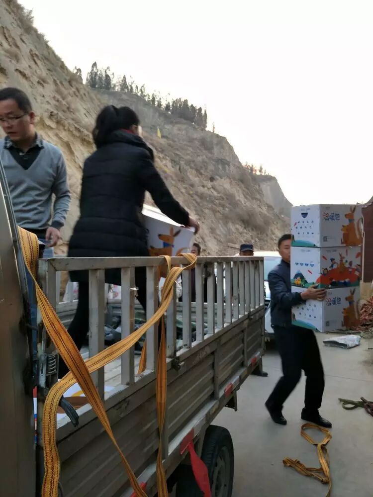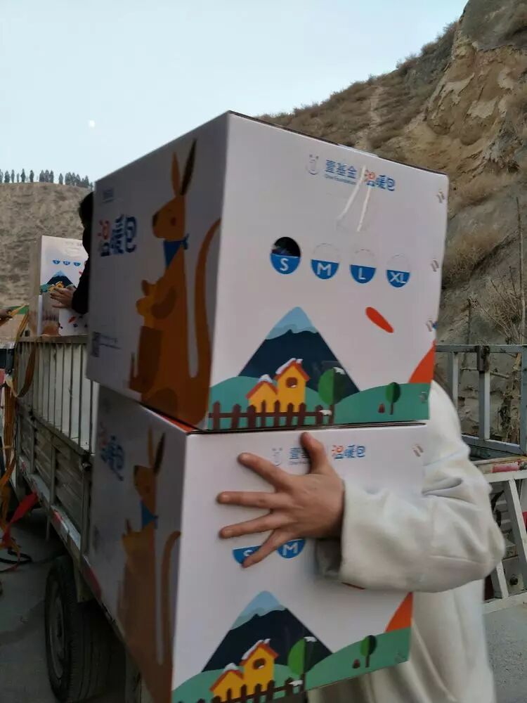 温暖包运到永靖后,志愿者们又齐心协力把温暖包卸下来,并妥善安置。