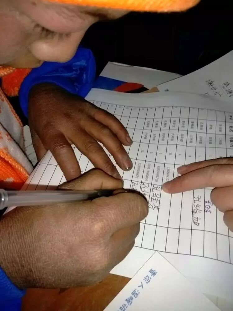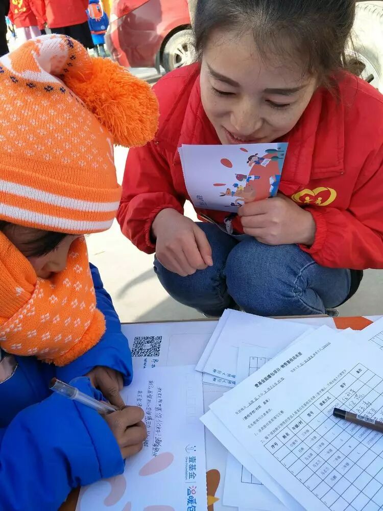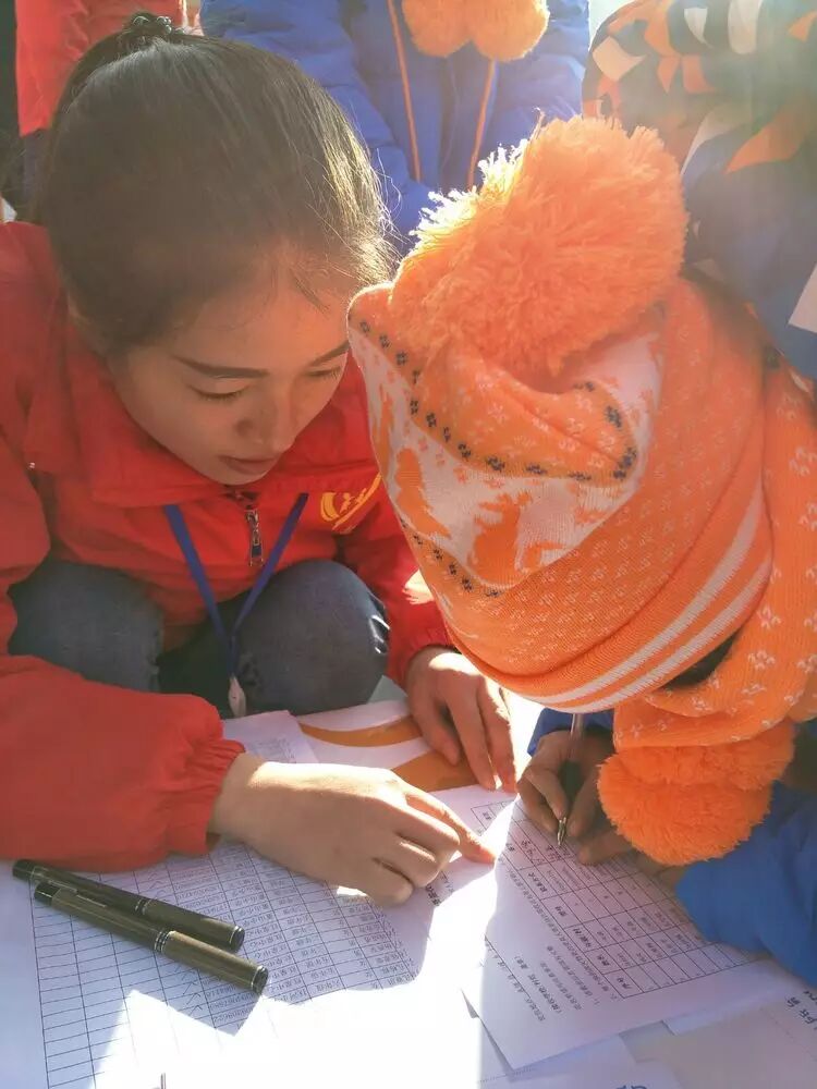 志愿者在教孩子把自己的名字填在签收表内。