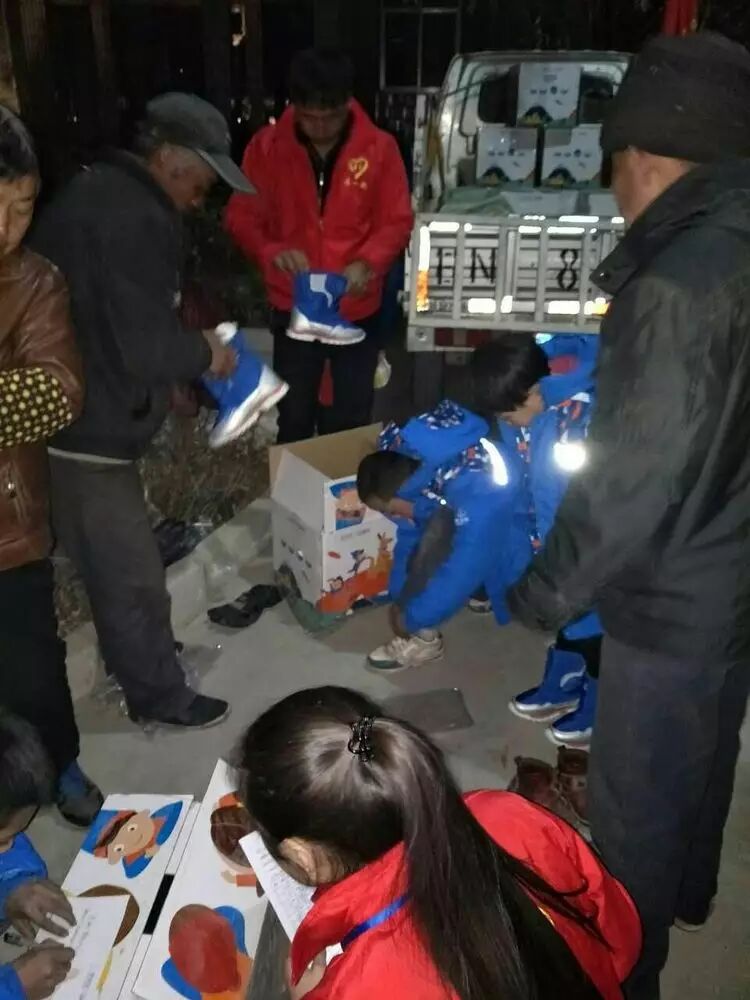 到盐锅峡镇抚河小学天已经黑了,但是为了等了一天温暖包的孩子们,天色再黑,天气再冷,志愿者们还是将温暖包送到了孩子们手中。