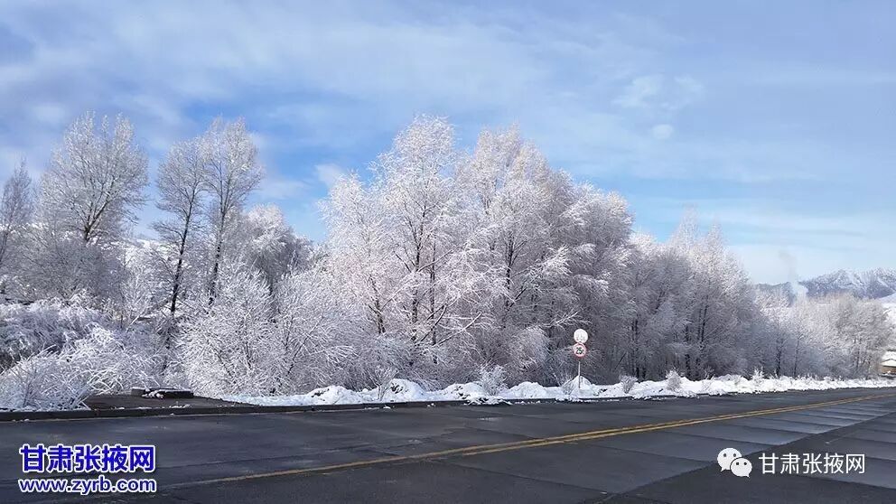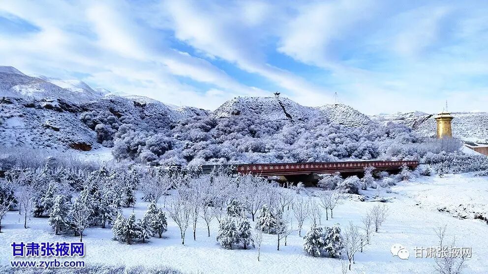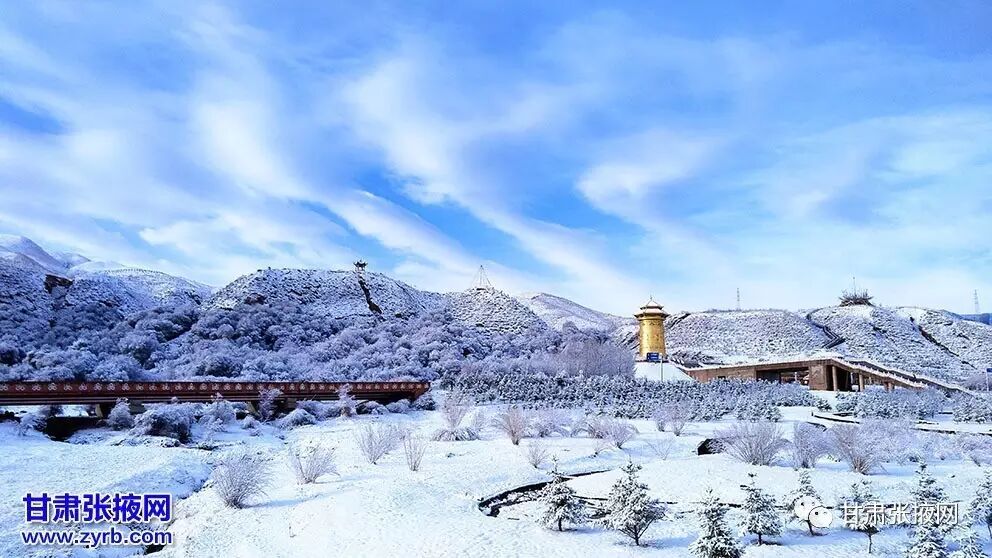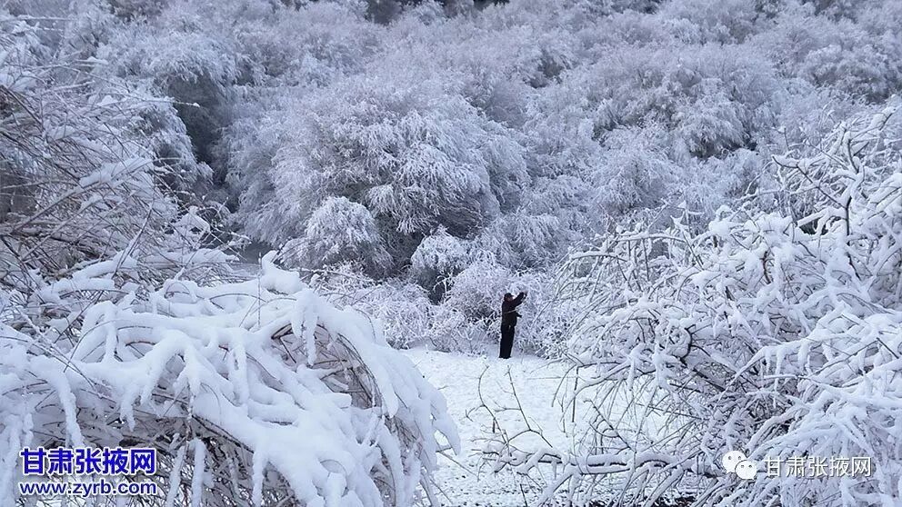 4月18日晚,甘肃肃南裕固族自治县再降春雪,裕固族风情走廊栈道、山峰和树木披上了“白色外衣”,整座山城肃南像林海雪原,银装素裹,晶莹洁白,县城红湾寺变为冰清玉洁的琉璃世界,雾气、雪花、冰凌、裕固族姑娘构成一个春天的童话世界。(武雪峰 摄)