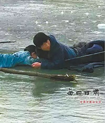 生死关头,岸上众人情急之中都顾不得寒冷,纷纷脱下身上的外套,并将衣服的袖子扎起来,形成一根长绳,让一个小孩拽着爬过去递给了救人的男孩。