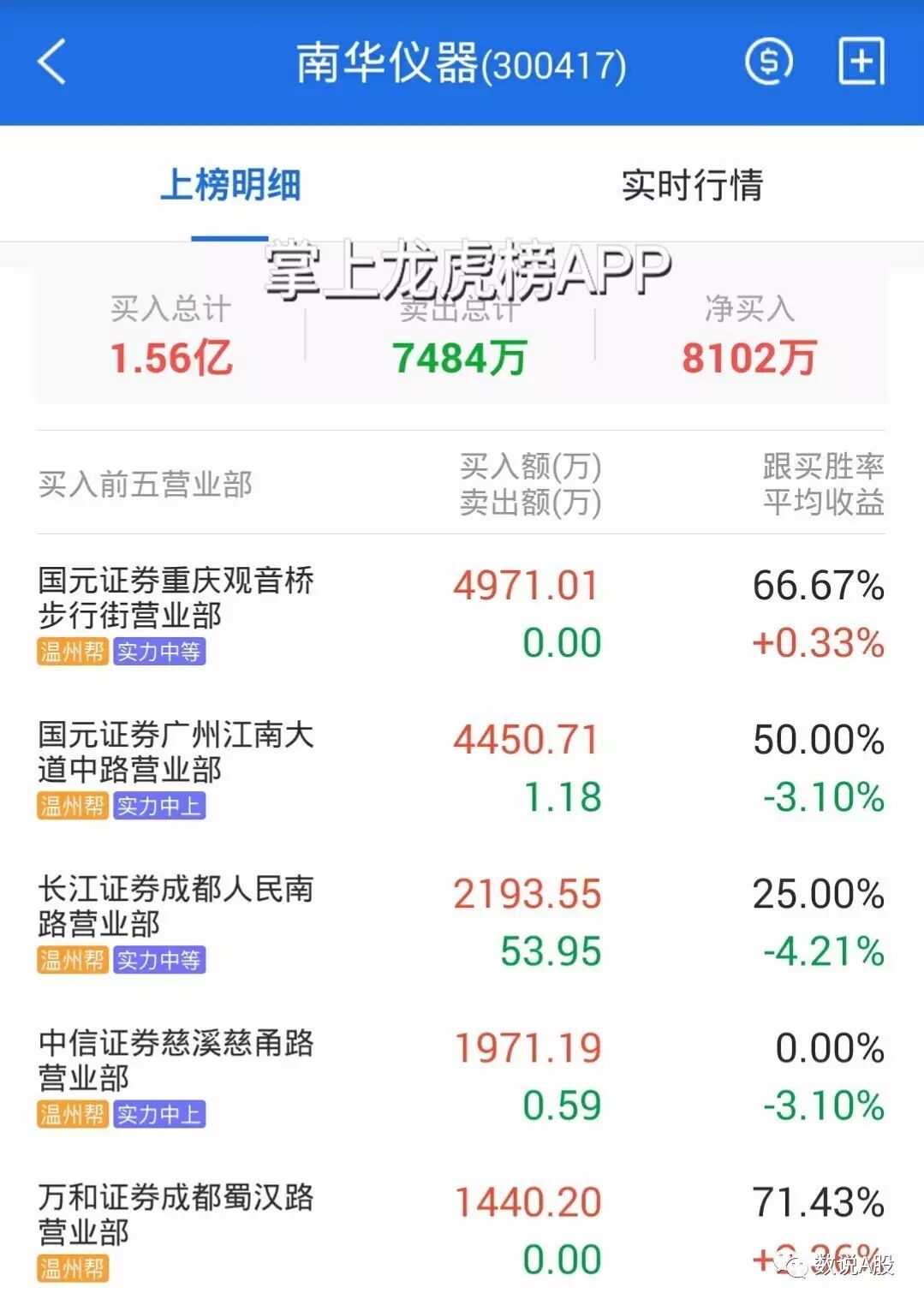 南华仪器:自从跌到45之后又重新加仓,为啥说加仓,是因为之前几个月的吸筹仓位较重,1月3日的跌停只不过出了一部分仓位。今天再次加速涨停,创了近期新高,而且榜上数据净买入8000万,看起来不错。不过需要对温州帮的手法谨慎,因为越来越多的人看龙虎榜,他反而可以反向做数据,加仓和新高后随机再度出货,这种可能性不是没有,而且不小。因而预估反而又是近期一个高点,当然,跌下去再反复做,那就是后续的事了。