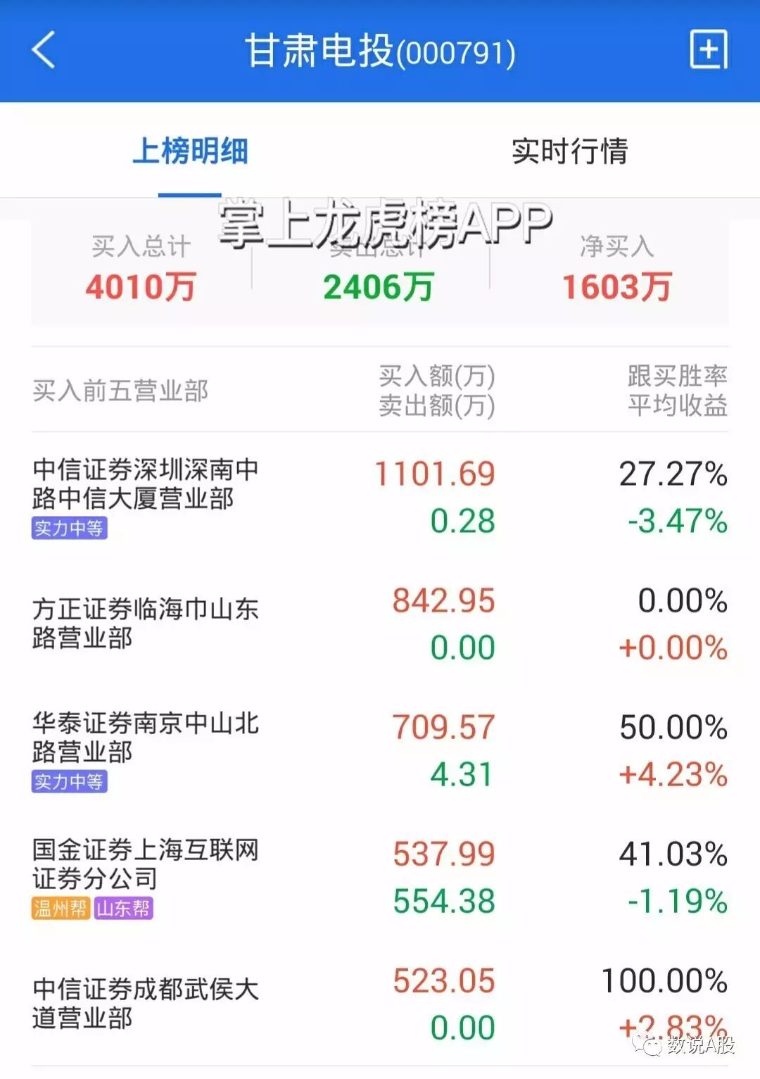 2、甘肃电投:买一成交占比2.01%,近期市场喜好抱团前庄股。