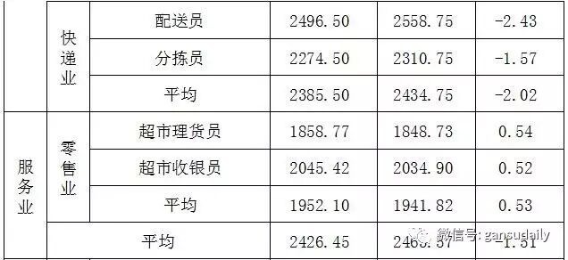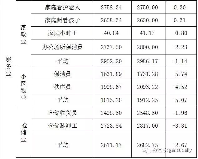 分岗位看,在监测的23类岗位中,与上月相比,建筑工地钢筋工、建筑工地壮工、小区物业保洁员、家庭照看小孩、轻工类车间一线操作工、小区物业秩序维护员、办公场所保洁员、餐厅后厨一线厨师、超市收银员、家庭小时工等10个岗位普通员工实际在岗人数增加,增幅分别为654.55%、11.41%、7.27%、4.51%、4.00%、2.89%、1.16%、1.05%、0.42%、0.24%;快递公司配送员、快递公司分拣员、纺织业一线操作工、养殖雇工、家庭看护老人、宾馆服务员、超市理货员、机械制造业一线操作工等8个岗位普通员工实际在岗人数减少,减幅分别为9.09%、5.88%、2.61%、2.11%、0.81%、0.62%、0.54%、0.32%;餐厅一线服务员、餐厅后厨配菜师、仓储收货员、仓储装卸工、电子行业一线操作工等5个岗位普通员工实际在岗人数持平。