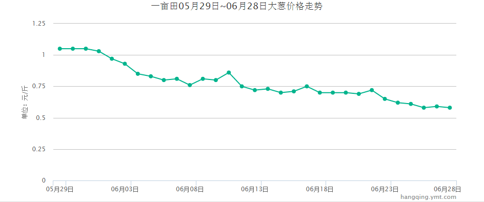 6月大葱价格持续下跌。截至6月28日,山东大葱均价0.35元/斤,较上月同期跌0.80元/斤,跌幅达69.57%,较3月份高峰期的3.6元/斤下滑超过90%,不抵3月份零头。