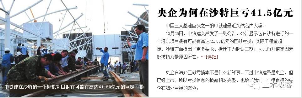 2008年6月中沙两国政府间签署《关于加强基础设施建设领域合作协定》之后的首个政府间合作项目、沙特50年来第一个轻轨项目、服务于朝觐者的铁路专线,再加上121亿元的大单(海外大单一向是央企们炫耀的资本),这些因素足以让中铁建非常得意了,所以它在09年年报中称这是“中沙两国标志性项目”。所有的这些荣誉都成为中铁建的累赘,并且挥之不去,因为领导对此寄予厚望,,中铁建虽知巨亏也不能停工,必须如期完工。