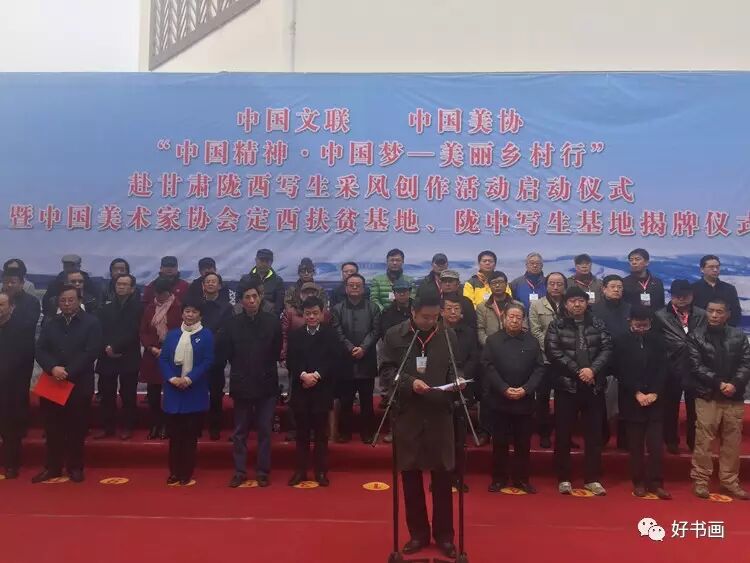 3月7日上午,中国文联、中国美协“中国精神·中国梦——美丽乡村行”写生采风创作活动启动仪式暨中国美协定西扶贫基地、陇中写生基地揭牌仪式在陇西县举行。中国美协理事、甘肃省美协主席李宝堂主持仪式,甘肃定西市委副书记、市长唐晓明,杜军先后致辞。采风团画家一行与定西市委常委、宣传部部长王美萍,,中国美协、各省市美协成员,定西市扶贫办、市文联、市文广局负责人,陇西县四大班子负责人及学生代表参加了启动仪式。仪式现场,中国美协和甘肃省美协的书画家为陇西县捐赠了美术作品,中国美协为马河镇贺家川小学捐赠了图书。