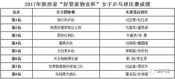 3月4日~5日,经过两天激烈争夺,由陕西省乒乓球协会、宝鸡市乒乓球协会主办、陕西好管家物业管理有限公司冠名举办的2017年陕西省“好管家物业杯”女子乒乓比赛,在宝鸡市宝铁健身俱乐部圆满落下帷幕。铜川市乒协、陕西好管家物业、西安红枫代表队喜摘团体赛三甲,刘亚青∕杜红波,亢丽萍∕翟西虎,牛春灵∕张勇三对夫妻组合获得夫妻混合双打比赛前三名。