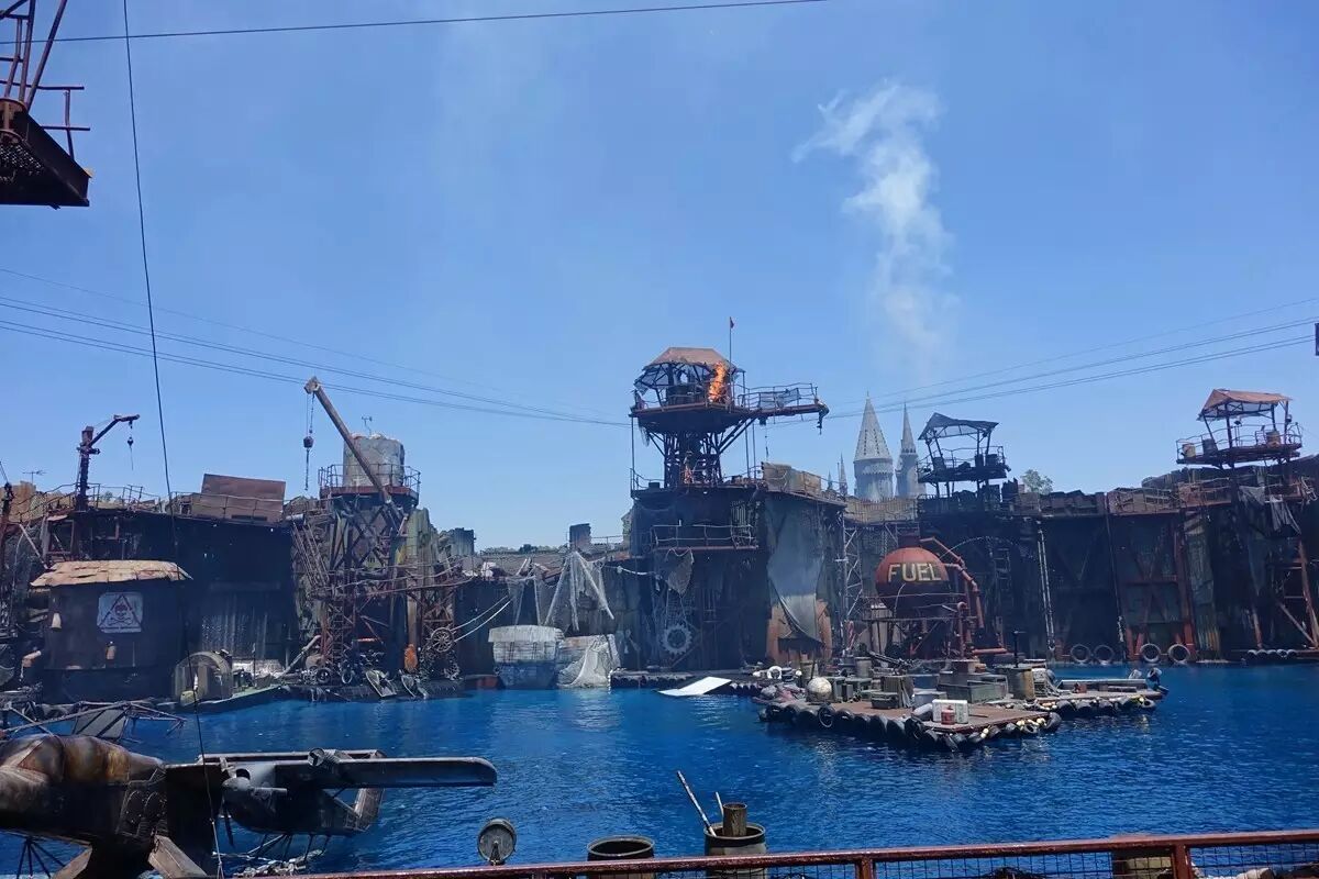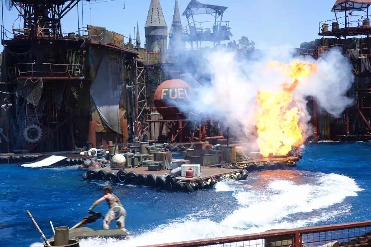 一车的人都大惊失色,乘着摇摇晃晃的车子落荒而逃。当我们离开摄影棚,见到户外的阳光时,才松了一口气。我们被水花所吸引,便来到了“侏罗纪公园激流勇进"。我们乘着小船来到隧道内,由于恐龙的咆哮和铁轨的碰撞。游客们纷纷尖叫起来,为这个游戏有增加了一丝神秘的气氛。说这时那时快,我们耳边已响起了倒计时“5、4、3……2……1”我们的心都提到了嗓子眼儿,连大气都不敢出。瞬间从84英尺高的斜坡猛冲了下去,感觉整个身子都飞了起来。是水花又重新将我们的心安抚了下来。好莱坞环球影城用先进的技术给人们带来了真实的体验与视觉上的冲击,为影视界做出了卓越的贡献,真不愧是人类的造梦机器。