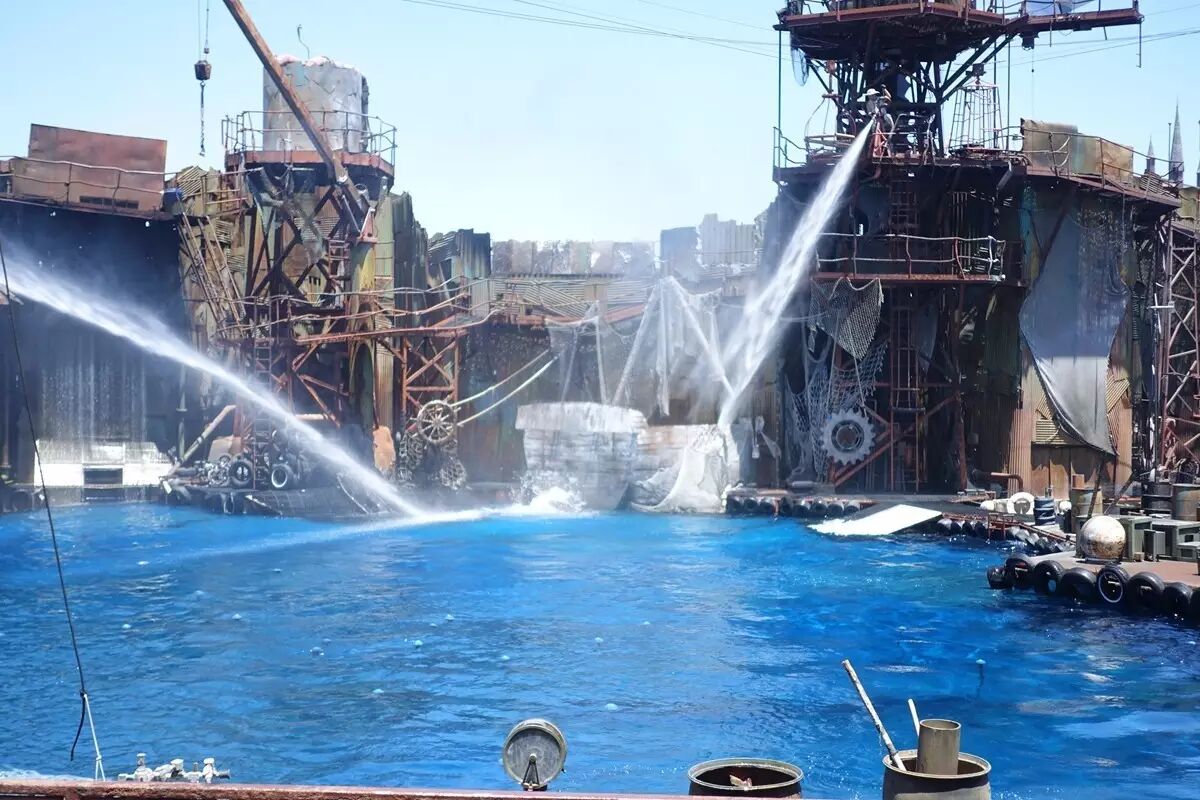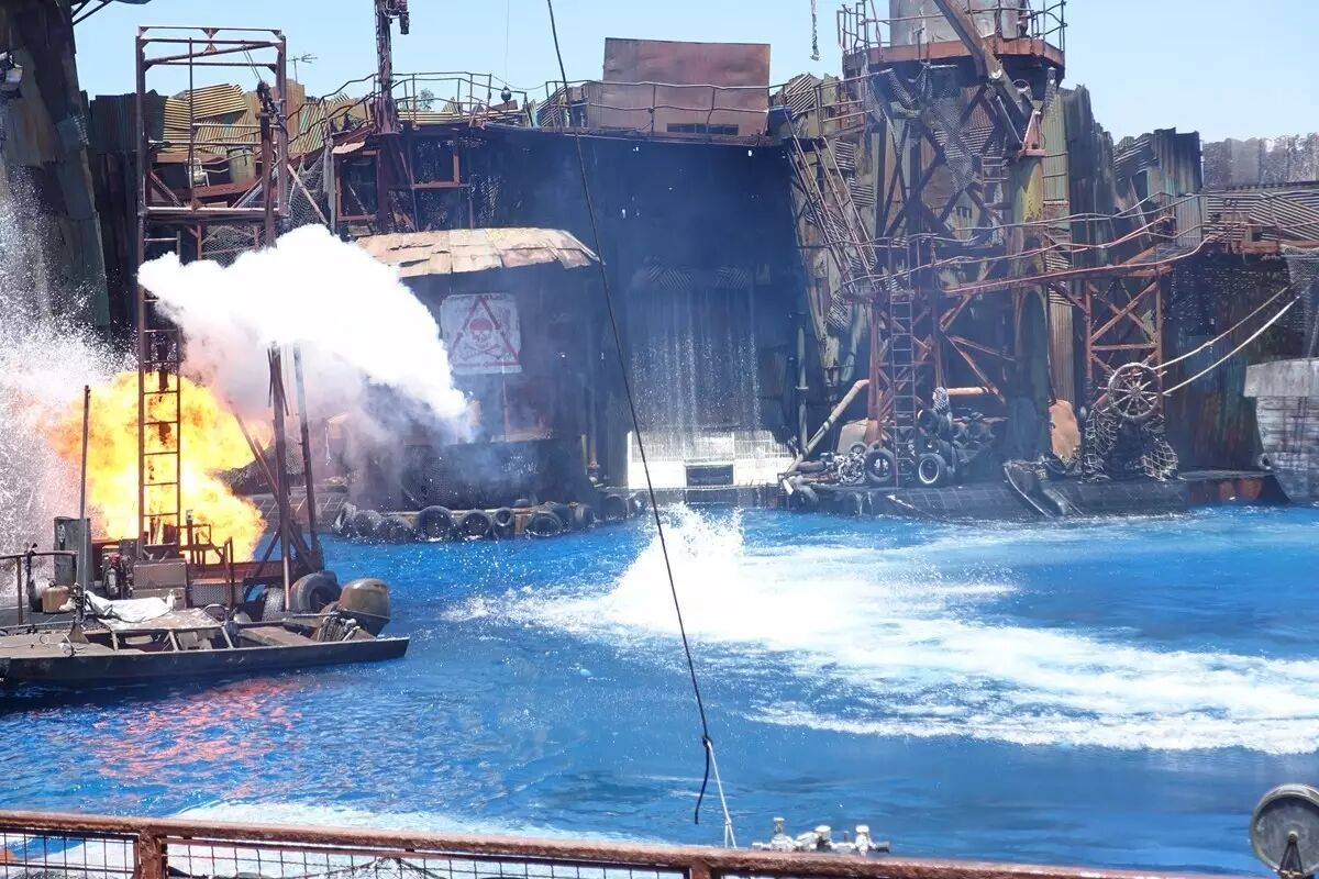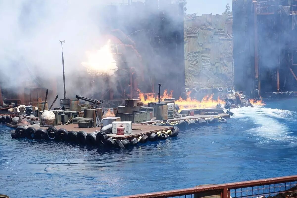 大多摄影棚内都能看见忙碌的工作人员,而这回的摄影棚却意外地无人工作,于是导游“偷偷”带我们进了去。车子平稳地行驶着,忽然,四周的灯闪烁起来,车身也开始摇晃。导游故作镇定地告诉我们:“这是洛杉矶经常发生的小地震。”话没说完,车身的摇晃更加剧烈了!为了使这模拟地震更加真实,导游恍然大悟似的惊呼:“这不是小地震,这是大地震啊!”不知何时,我们左方两辆车迎面相撞,擦出的火苗点燃车身,又蔓延至整个摄影棚,热气扑面而来。游客也惊呼起来,生怕逃不出去,“葬身”火海。右侧又传来一声巨响------水管爆裂了,水喷涌而出。“洪水来啦!洪水来啦!”导游尖锐的声音再次从广播中传来。只见水花迸溅着,领着巨浪向我们涌来!