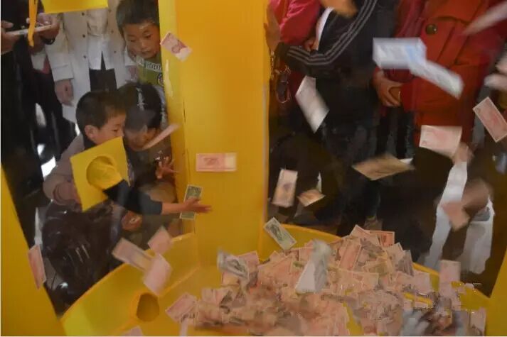 真金白银,¥100、¥50、¥10等各种现金,参加者双手去抓被鼓风机吹舞起的现金,规定时间内,抓到多少赚多少!
