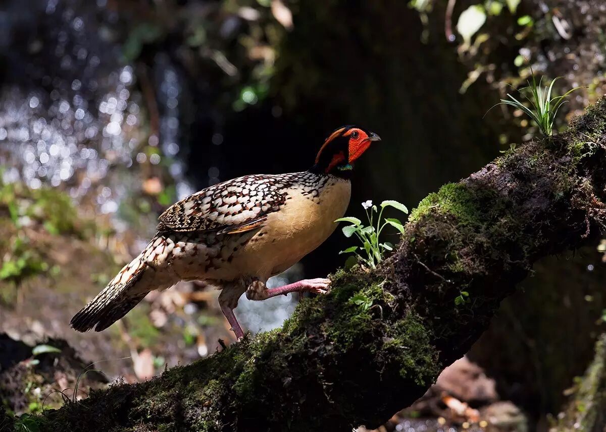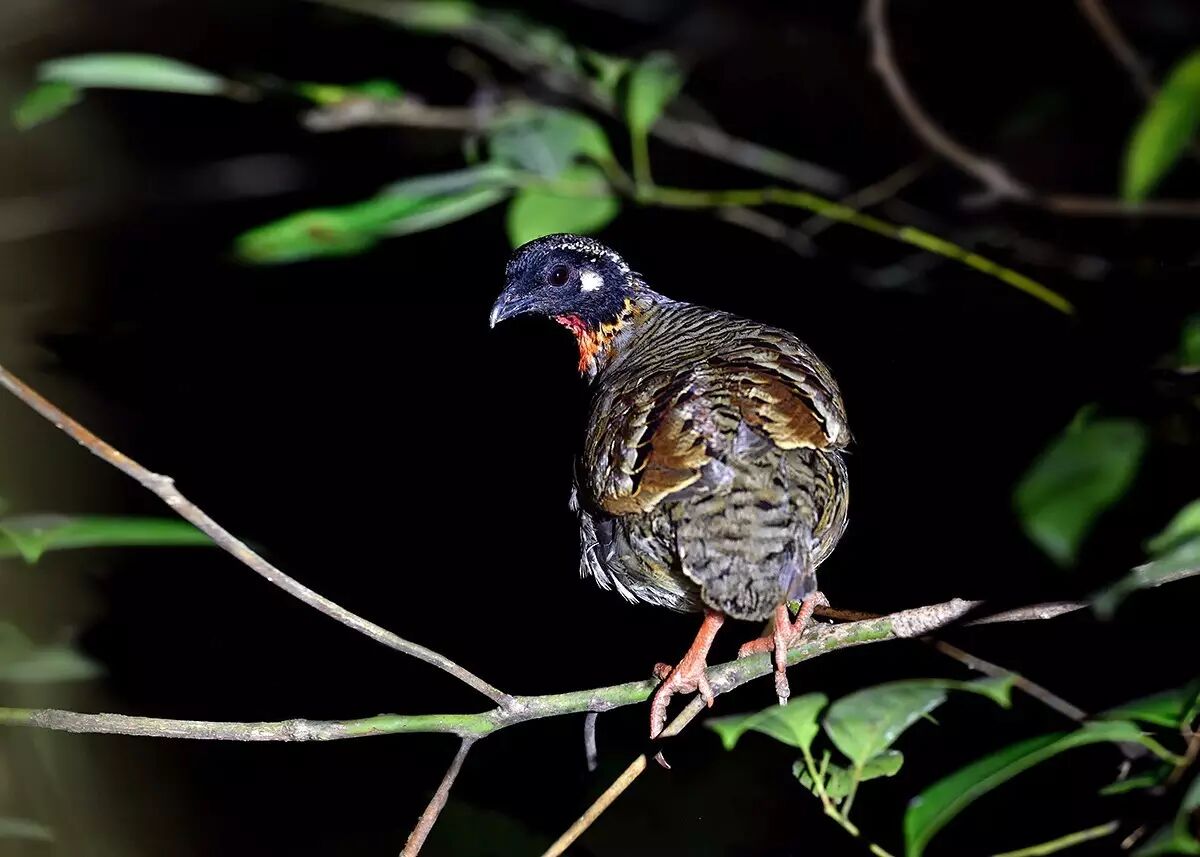 它是山鹧鸪属鸟类中羽色较为美丽的种类,仅分布于海南省,属于国家一级保护动物,也是全球性易危物种。它的额、眉纹、颊、头侧以及颏、喉均为黑色且连成一片,黑色眉纹上方散着白点,形成一条白纹向后延伸至后颈。