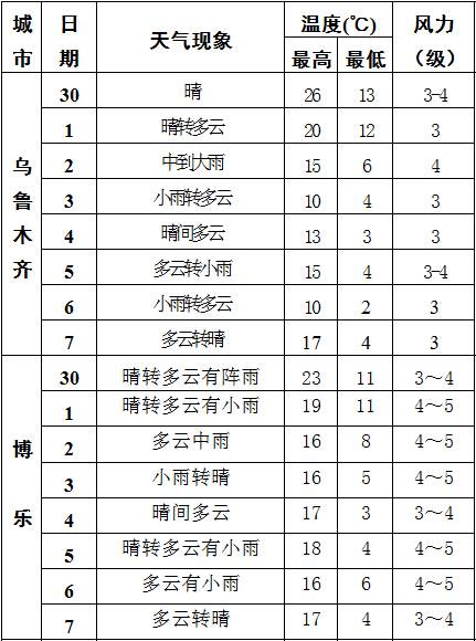 1号白天,伊犁河谷、博州、塔城、阿勒泰、北疆沿天山一带、天山山区等地的部分地区有微到小雨,山区局部有中雨。