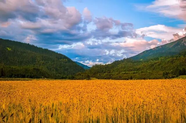 其实从8月起,秋天的脚步就已经来临,它最先光临高原的青稞田地,时间每过去一天,秋日的艳阳将雨季赶得越远,湛蓝的天空下翻滚起来金黄色的麦浪,一直绵延到雪山脚下。