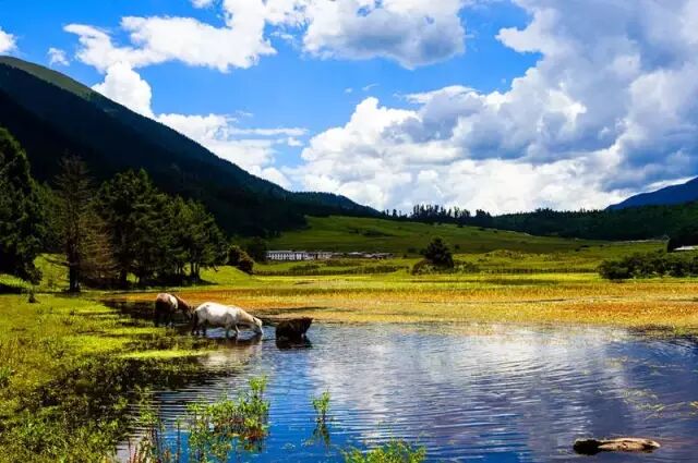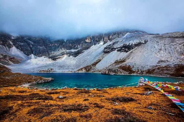 环抱高原海子的水草也由养眼的绿色向迷人的金色变化。各色的高原海子倒映着青黄相间的白桦林、皑皑雪山、藏族村寨,让人感到祥和而宁静。