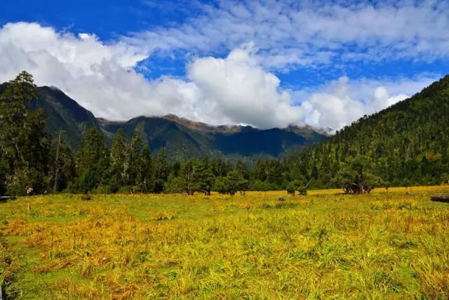从稻城前往亚丁的路上会穿越川西风光最美的彩色林带,领略神奇的四季更替;洛绒牛场上的移动牧群点缀在一片金黄之中,犹如浮动的云朵,煞是好看。