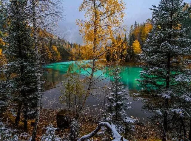 蓝天、白雪、彩林、湖泊在眼前交相辉映。