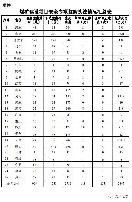 按照《国家煤矿安监局关于印发2016年7项专项监察方案的通知》(煤安监监察〔2016〕7号)要求,各省级煤矿安监局及所属监察分局深入开展了煤矿建设项目安全专项监察,共抽查煤矿建设项目906处,查处各类安全隐患和问题3755条,下达执法文书1231份,责令局部停止施工118处,责令停止建设135处,行政罚款2847万元(详见附件)。通过此次专项监察,发现煤矿建设项目安全存在以下突出问题: