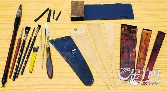 在漆画工艺中,主要运用漆刮、漆刷、描绘漆笔、扫笔、夹子、箩 筛、研磨器具、磨炭、头发、水砂纸、油罐、玻璃板等,此外还有荫房、荫橱、刻刀、切刀、剪刀、锉刀、铲刀以及磨刀器具乃是漆画装饰工艺必备的工具。