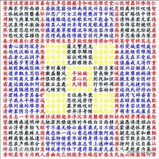 璇玑图最早的五色已不可考,后人通过颜色区块的划分来解读《璇玑图》。因而有七色读法、井栏读法等形形色色的方式。上图是一幅选自《镜花缘》的《璇玑图》的五色读本。