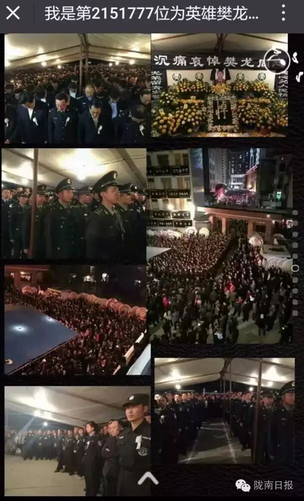 追悼会现场,社会各界人士和普通市民纷纷自发赶来参加遗体告别仪式,向樊龙致敬的挽联和花圈摆满了巡警大队的整个院子。送别人数过万,武都城区一时出现“万人空巷送英灵”的感人场面。市区很多花店的鲜花都被吊唁的人买光了。