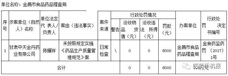 日常检查发现,甘肃中天金丹药业有限公司未按照规定实施《药品生产质量管理规范》,金昌市食品药品稽查局依法对其罚款6000元。