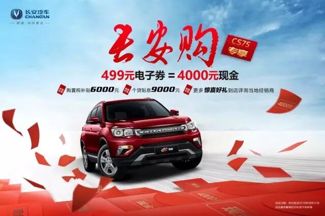 2016款长安cs75全系购置税补贴6000元,购车即送装饰礼包。长安cs75五星安全标准,更有2.0vvt/1.8t高效动力组合 。
