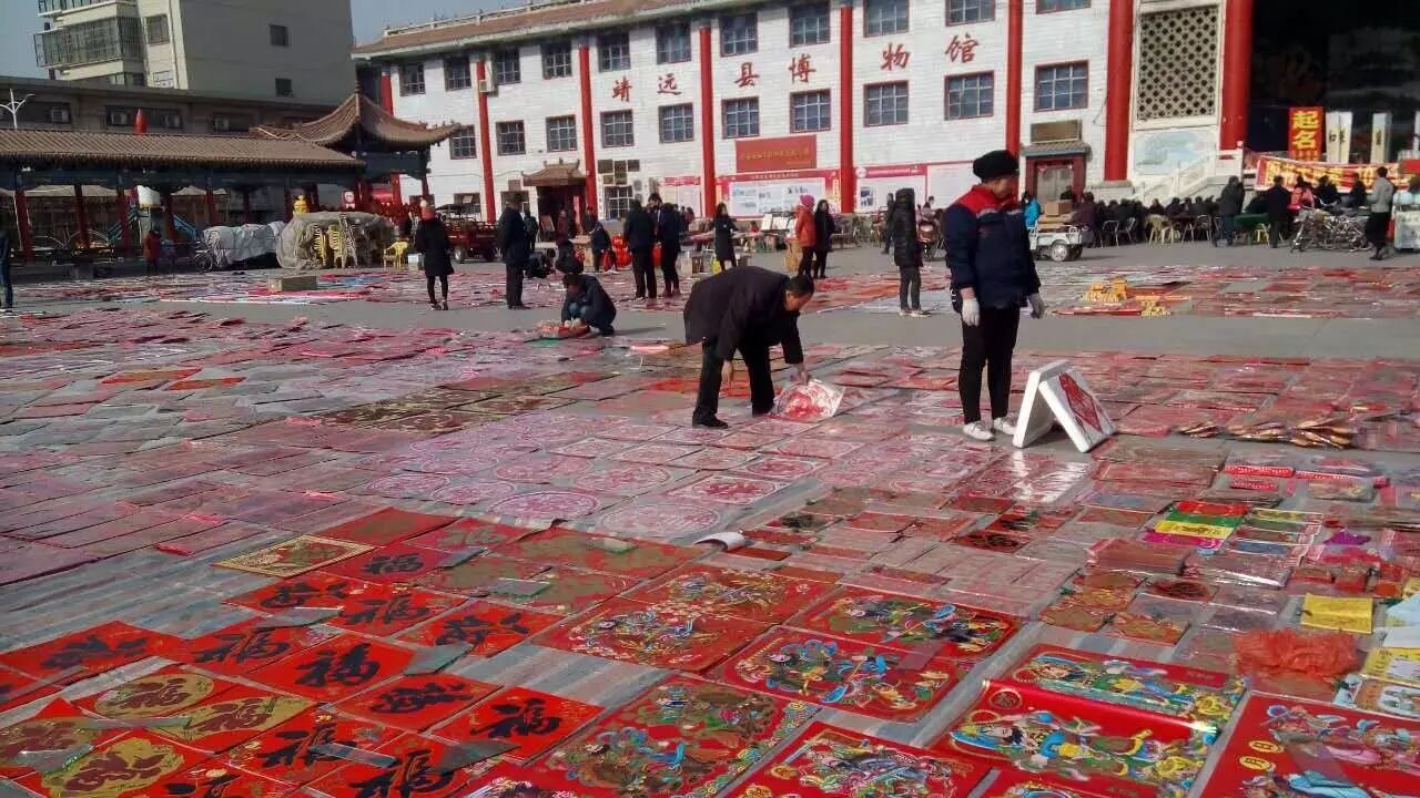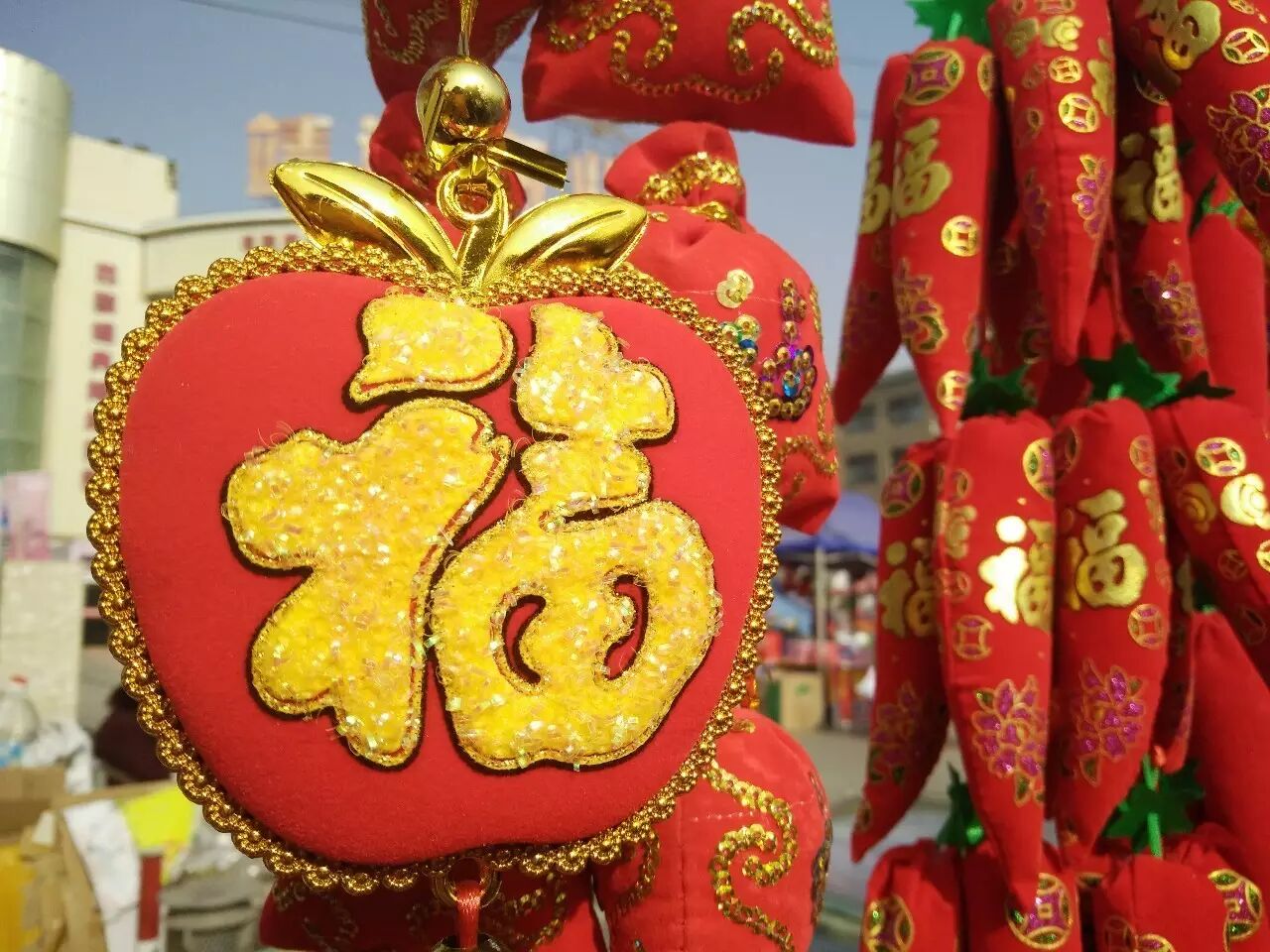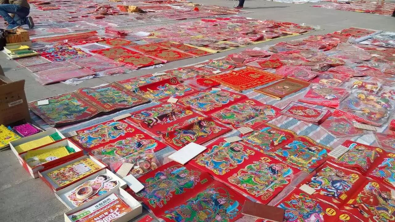 鼓楼附近也摆满了各种各样的门神、福字,