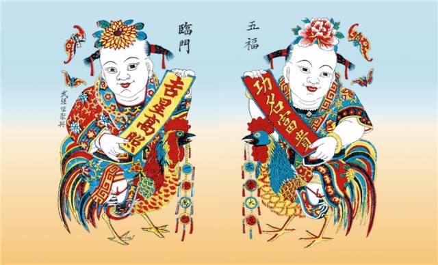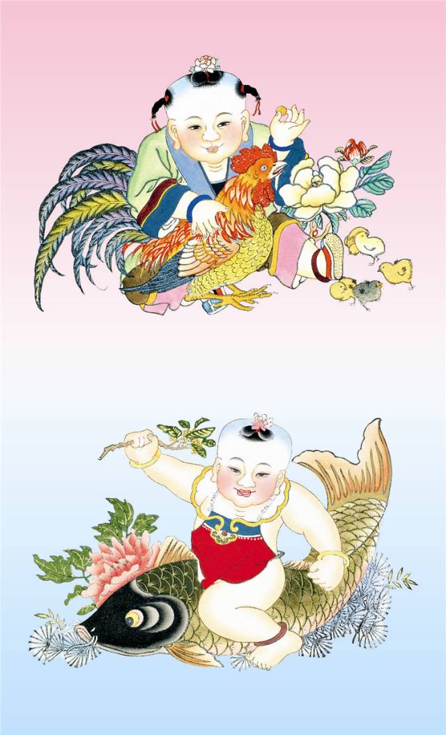 因为门神画上是小娃娃骑着大公鸡,杨柳青的年画是小娃娃抱着大鱼和公鸡,都是小孩子喜欢的玩意。调皮的我,走路还不稳时,就会追着家鸡跑,惹得它们咯咯地乱叫,自己就笑弯了腰。