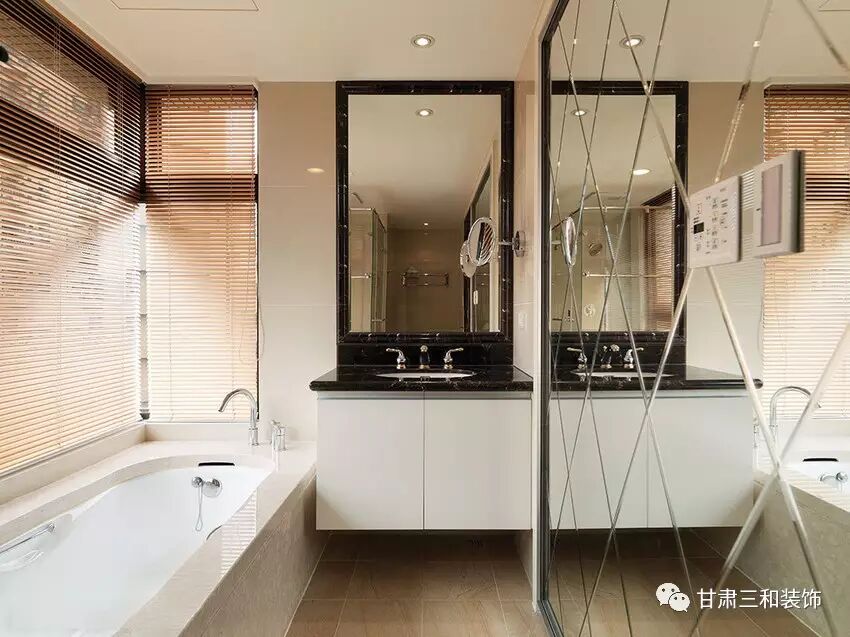 合理的安排洗手台浴缸位置,加上镜子的效果,可以使视觉空间和实用都大大增加。