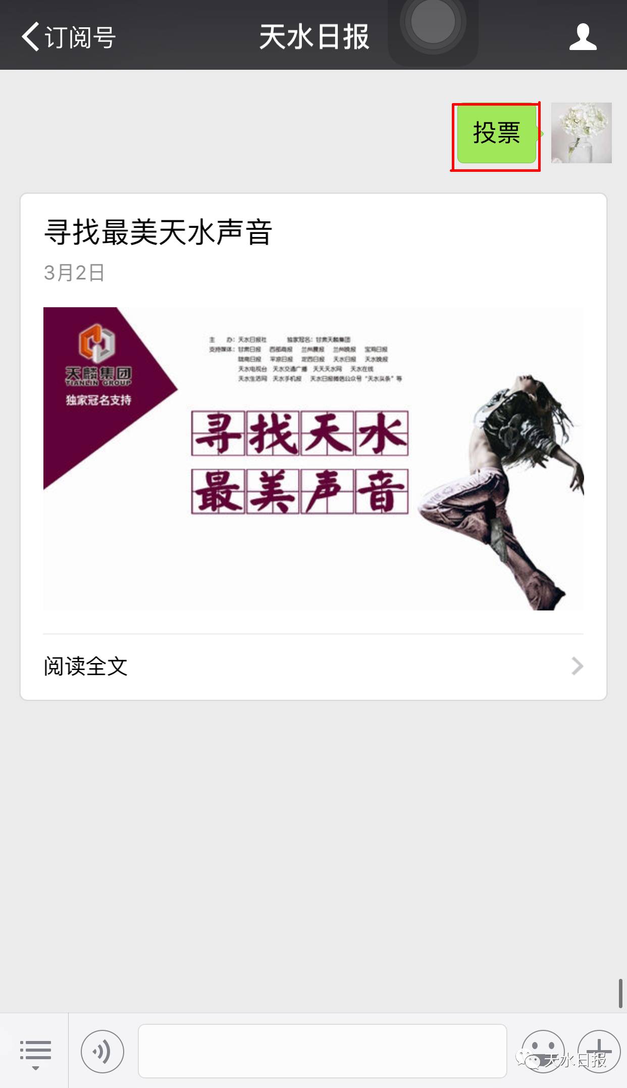 方法一:回复"投票”至“天水日报公众号”,进入“寻找最美天水声音”投票页面: