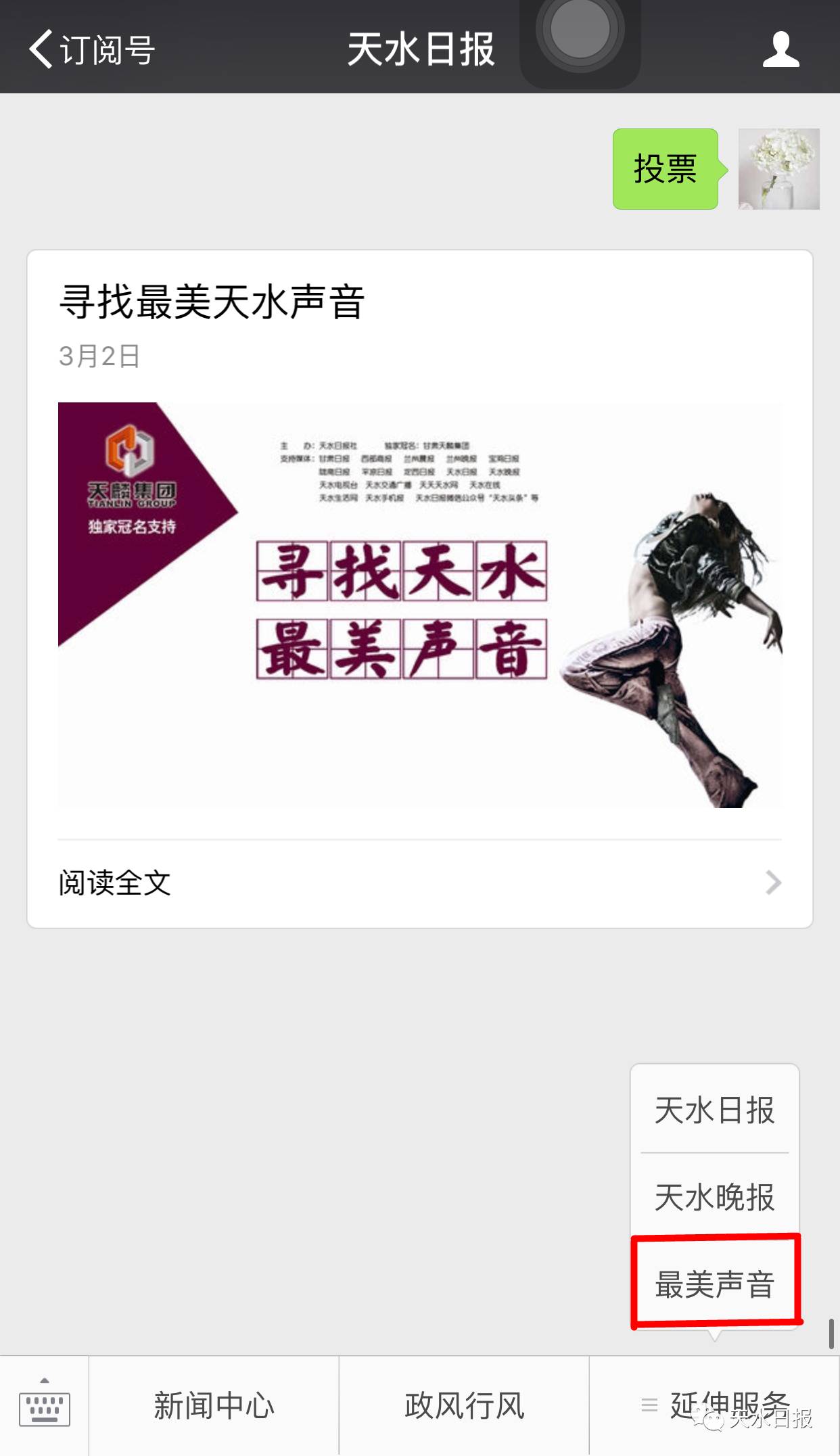 方法二:在公众号右下角点击"延伸服务”至“最美声音”,进入“寻找最美天水声音”投票页面: