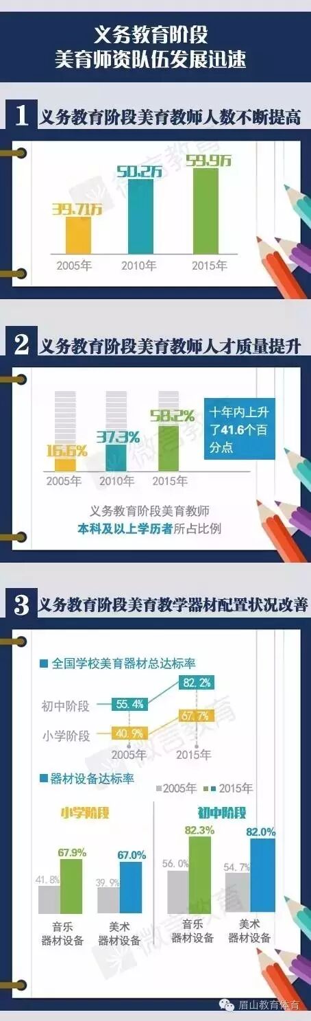 中小学艺术专用教室的配备率大幅度提高,艺术教学器材与课外活动场地的条件得到明显改善。今年5月,、美术教学器材配备标准》,指导各地进一步提高中小学校美育教学条件装备水平,为提升教学质量提供保障。据统计,2005年—2015年,全国小学阶段学校艺术器材达标率由40.9%提高到67.7%,初中阶段学校艺术器材达标率由55.4%提高到82.2%,均提高了26.8个百分点。