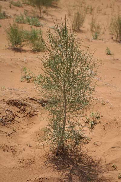 梭梭被誉为“沙漠生态的保护神”,一棵成年梭梭的树冠能达到3-5米,发达的根系则足可固定10平方米的沙漠。然而用梭梭固沙的探索之路,并非一帆风顺。