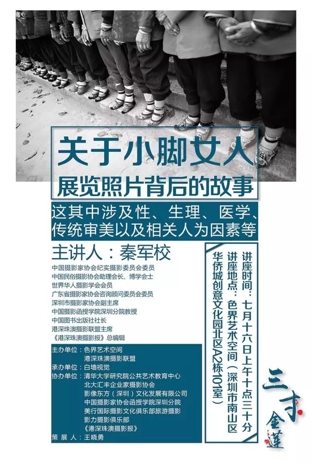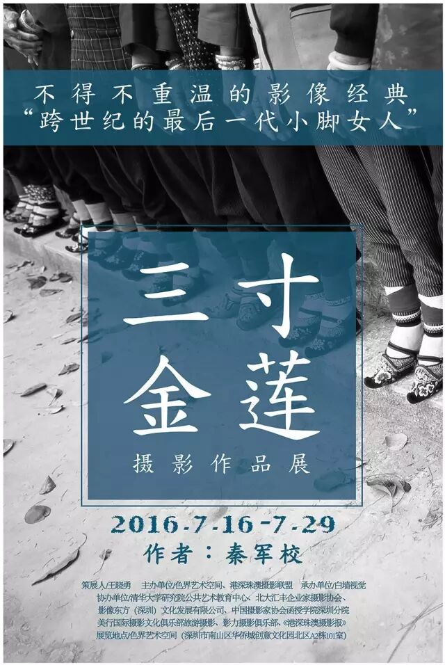 由王晓勇策划,色界艺术空间、港深珠澳摄影联盟主办,白墙视觉承办,清华大学研究院公共艺术教育中心、北大汇丰企业家摄影协会、影像东方(深圳)文化发展有限公司、中国摄影家协会函授学院深圳分院、美行国际摄影文化俱乐部旅游摄影、影力摄影俱乐部、港深珠澳摄影报联合协办的秦军校先生原作典藏展——《跨世纪的最后一代小脚女人——三寸金莲》将于2016年7月16日在色界艺术空间(深圳市南山区华侨城创意文化园北区A2栋101)隆重展出。