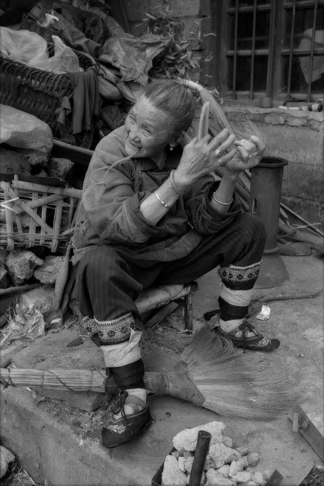 正在梳头的小脚女人肖秀梅(云南罗平 2002)