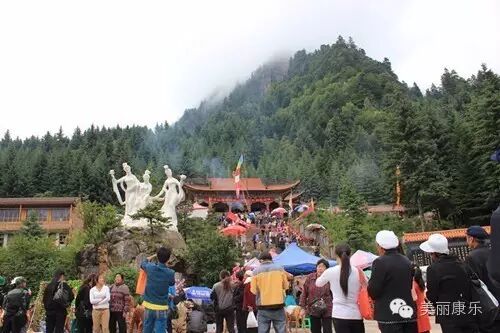 莲花山高入云表,万山朝拱,洮河、冶木河映带左右,小莲花山、姊妹山顾盼有情。其景色随四季而变化,春有花,夏有绿,秋有果,冬有雪。具有华山之险、黄山之奇、青城之幽、峨嵋之秀。从半山腰的唐坊滩开始,翩翩起舞的“三仙女”仙石,含笑恭迎贵客的到来。拾级而上,登莲花宝殿、十八罗汉楼、头天门、二天门、三天门、四天门、紫霄殿、娘娘殿、舍身殿、转阁楼、吴家庵、圣仙洞至祖师大殿,上山的路线就成了回环形。从西面上,东面下,上时经过第一道险道独木桥。此处两边断崖几十丈,有一丈多地方因无法凿有石洞,两洞间贯一铁链,配有扶手,一环一步,易上难下。再上,就是打儿湾、金顶,金顶是莲花山第二高峰。从金顶东上就到了夹人巷。这是此山第二处险道。巷长二丈有余,只容一人通过,陡得犹如登梯,配有铁索作为扶手。继续东上就到了峰顶玉皇阁,海拔3578米,极目四望,山下群峰锁抱、万山碧绿;山间白云缠绕,枇杷翠竹,轻纱素裹。风云雨晦,变幻莫测。时而红日高照,晴空万里,四野尽染,绚丽多姿;时而云腾雾绕,雷鸣电闪,大雨滂沱,烟雨朦胧;时而朝霞撒彩,夕阳晚照,万山如洗,娜婀多姿。真是“山势腾腾凌云气,松柏幽隐起雾烟,白云出绣红日尽,远望无际天地宽”。饱览玉皇阁美景,游过终年结冰的水帘洞,下山就到了“鹞子翻身蛇倒退”。这是此山第三道险隘,配有两根下垂的铁链。人下时,必须手握铁链,足踩石阶,一环一阶,犹如悬梯。快下到底时,还得从左面向右面跨一大步,转到右面,顺右面的铁链倒下三阶再下几阶才能到底。再下,就到了东方顶,至此险处已过,可谓是山险景奇,步步为画。