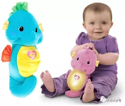 费雪安抚小海马可谓风靡全球,销售一直很火爆,有粉蓝两种。小海马肚子上有红心标志,会吸引宝宝去按去拍,按下小海马的肚子会有音乐发出并伴随柔和的灯光,有8首摇篮曲+模仿子宫中环境羊水咕噜咕噜的背景声音,既可以陪宝宝玩耍(亲亲、拍拍、抱抱)也可以哄宝宝睡觉。