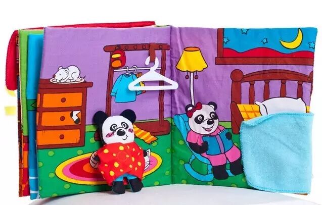 这本书描述的是熊猫宝宝介绍自己的家:客厅、餐厅、卫生间、睡房......书中有插口、有挂钩的地方,宝宝可以安排熊猫宝宝在房间里游戏,再餐厅里用餐、在澡盆里洗澡、在睡房里睡。