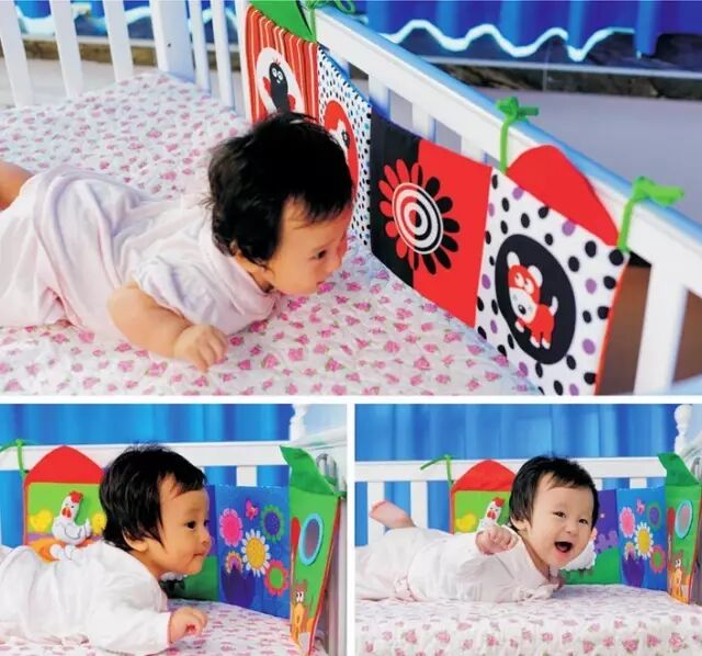 A 比如,有这种长条状的布书,可以围在婴儿床边,刚出生不久的小婴儿就可以对着它看啦: