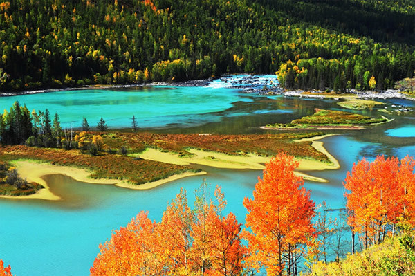 喀纳斯既有北国风光之雄浑,又有南国山水之娇秀,不同的植物群落色彩层次分明,每年9月尤是,金黄、殷红、墨绿各呈异彩,随着天气的变化每天都更换着不同的色调。